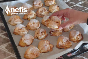 - Üzerine çırpılmış yumurta sarısı–krema karışımını ekleyip yumuşak bir hamur yoğurun.