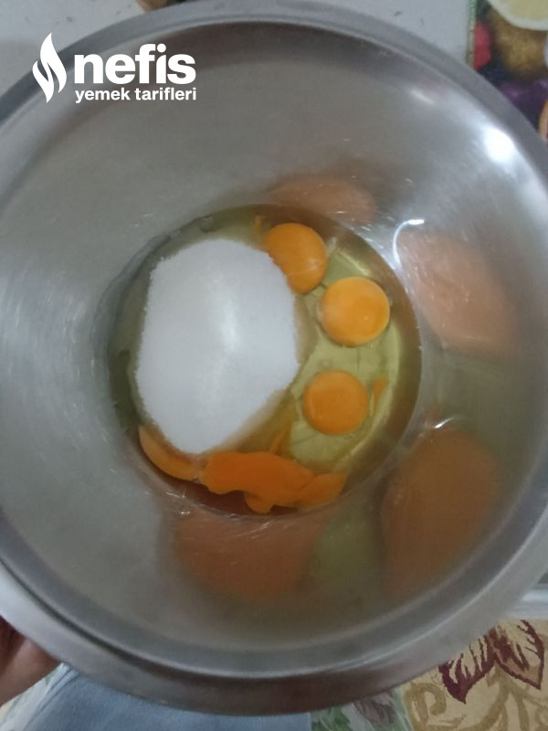 1. Karıştırma kabına yumurtaları ve toz şekeri alıp köpürene kadar çırpalım.