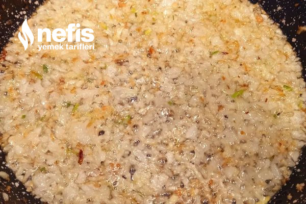 6. Tavada yağla bir arada yemeklik doğranmış soğanı soteleyelim ve kesilmiş yufka karışıma ekleyelim.