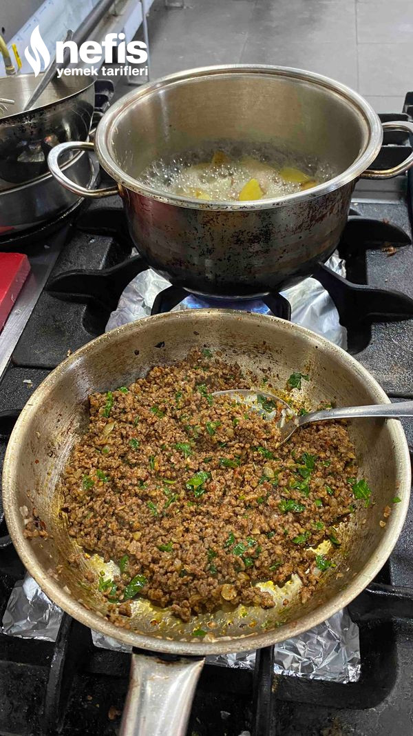 - Kıymayı ekleyin. Pişince salçayı,isotu,karabiberi,tuzu ekleyip karıştırın.