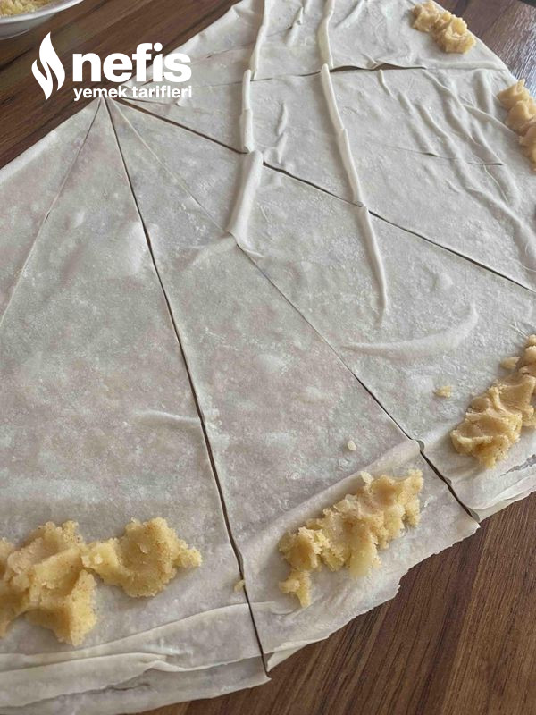 1. Patatesleri kabuklarını soyalım, üzerine su ekleyip tencerede haşlayalım, haşlanan patatesleri ezelim, tuz ve toz biberi ekleyip karıştıralım, yufkadan bir adet tezgahımıza alalım yufkanın içine yağ sürelim ikiye katlayalım, 8 eşit kesime keselim.
