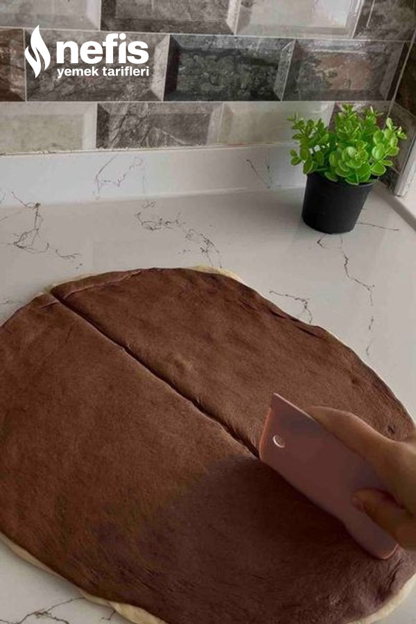 - Diğer kakaolu hamuruda tıpkı biçimde açalım ve sade hamurun üzerine alarak ortadan ikiye keselim.