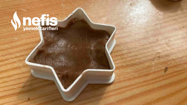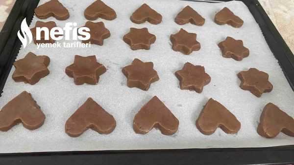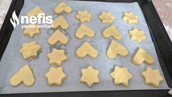 - Vaktiniz varsa hamuru buzdolabında bekletip iki yağlı kâğıt ortasında merdane ile açabilirsiniz. Ben açmadım direkt ceviz büyüklüğünde modüller alıp yıldız ve kalp kalıbına bastırıp biçim verip,hafifçe bozmadan çıkarmayı tercih ettim,burda ceviz büyüklüğünde olmasına dikkat edelim çok kalın olursa pişen kurabiyelerin içi hamur kalır.