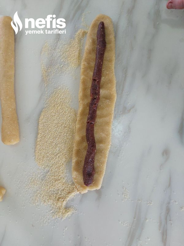 - Silindir hali ne getirip hamuru üzerine bastırarak yayınız içine kakaolu hamurdan koyup kapatınız.