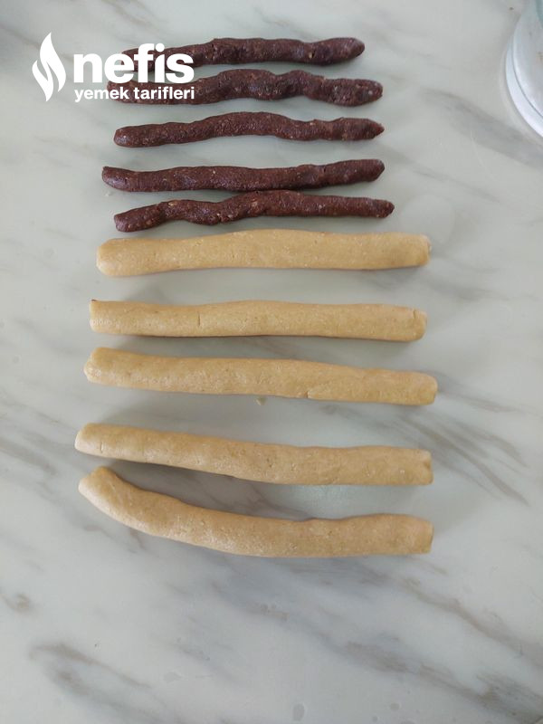 - Sonra hamurun 4/1 ni ayırıp içine 1 tatlı kaşığı kakao ,1 çay kaşığı tarçın ,2 yemek kaşığı sıvı yağı ve cevizi ekleyip güzelce yoğurunuz sonra 2 hamuruda 5 eşit kesime bölünüz.
