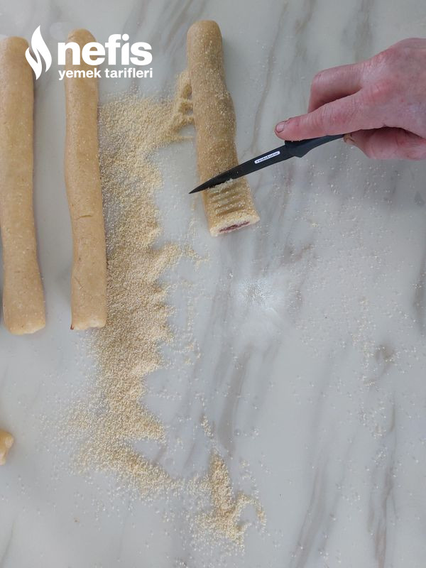 - İrmiğe bulayıp çatalla biçim veriniz 2 parmak kalınlığında katıyız ve yağlanmış tepsiye diziniz.