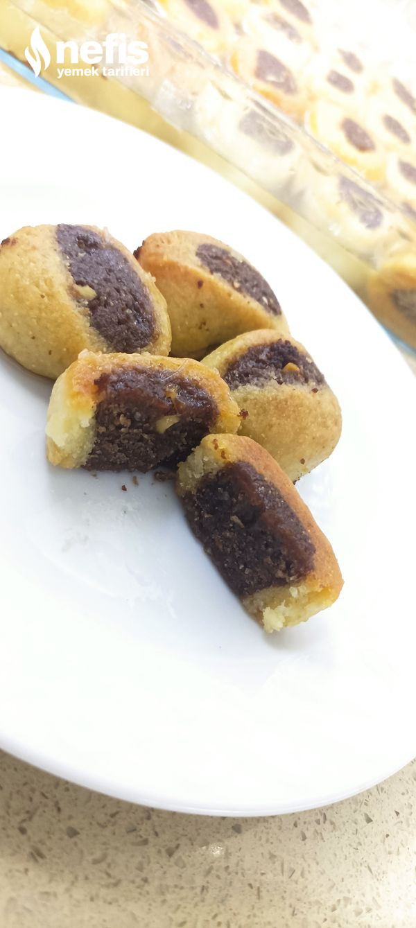 4. Beyaz hamuru elinizle ya da merdane ile açıp inceltiyoruz. Kakaolu harcı elimizle ince uzun olacak biçimde yuvarlayıp açtığımız beyaz hamura uzunlamasına koyuyoruz. Akabinde sarıyoruz.