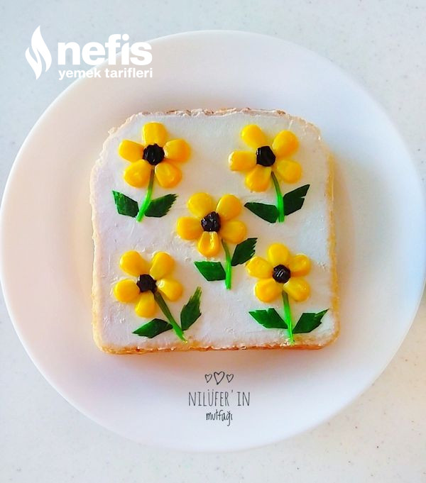 1. Tost ekmeğine peyniri sürelim mısırdan papatya oluşturalım. Ortalarına zeytin yahut çörek otu koyalım.