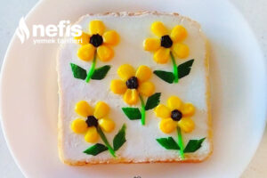 1. Tost ekmeğine peyniri sürelim mısırdan papatya oluşturalım. Ortalarına zeytin yahut çörek otu koyalım.