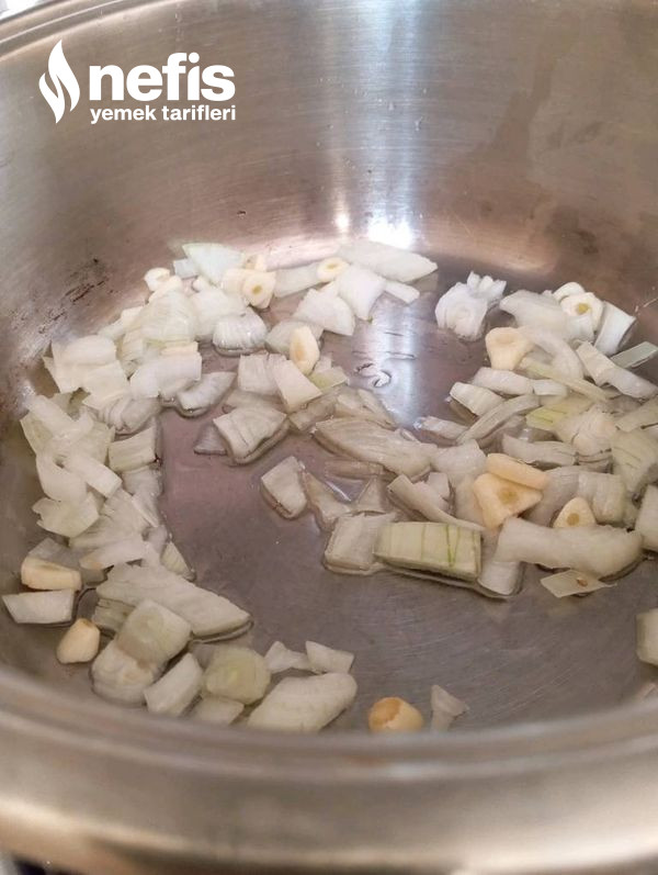 3. Uygun bir tencereye soğanı be 3 lisan sarımsağı yemeklik doğrayıp 3 kaşık sıvı yağ ile kavurun.