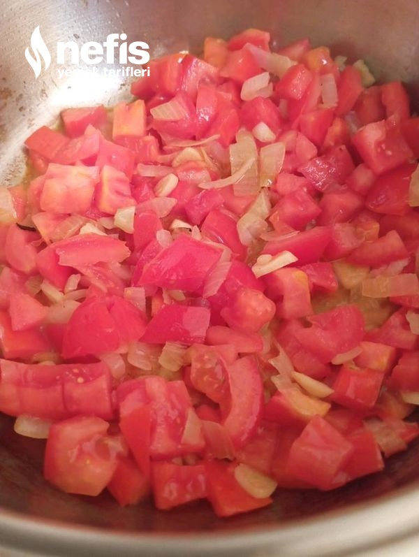 4. Üzerine küp küp doğranmış 3 tane domatesi ekleyip biraz daha kavurun.