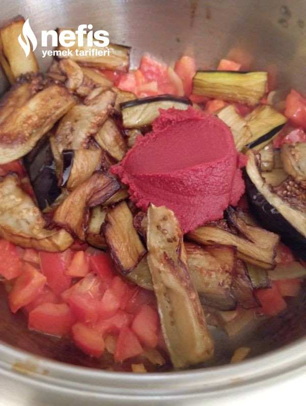 5. Kızartıp fazla yağını aldığınız patlıcanı ve 1 yemek kaşığı salçayı ekleyin bir iki çeşit karıştırın.