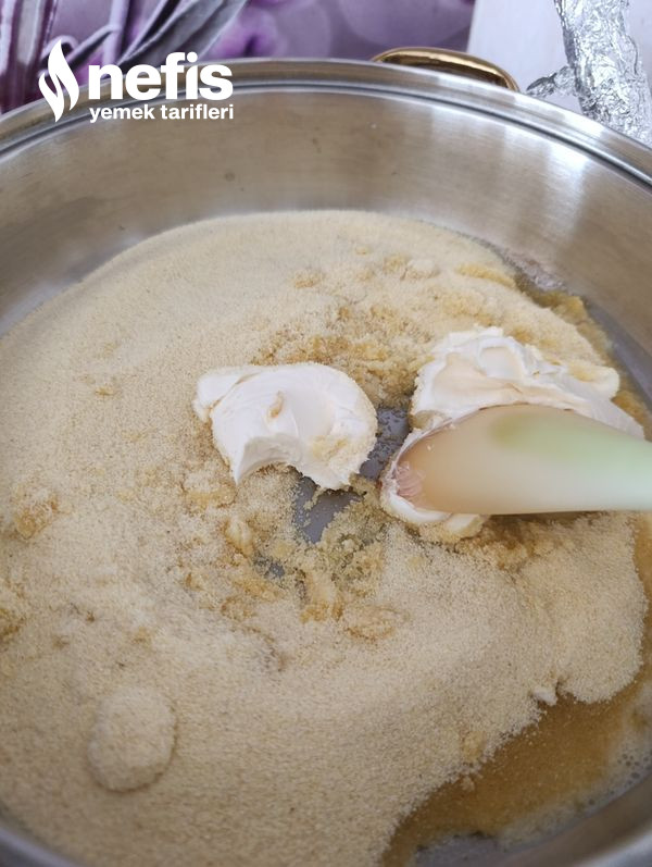 - Derince bir kaba yağı alıp, üzerine irmik ek edilir.