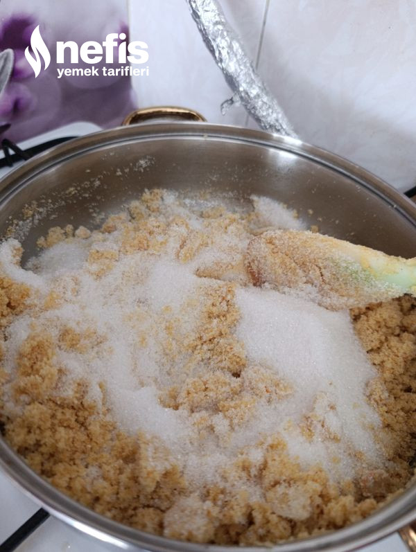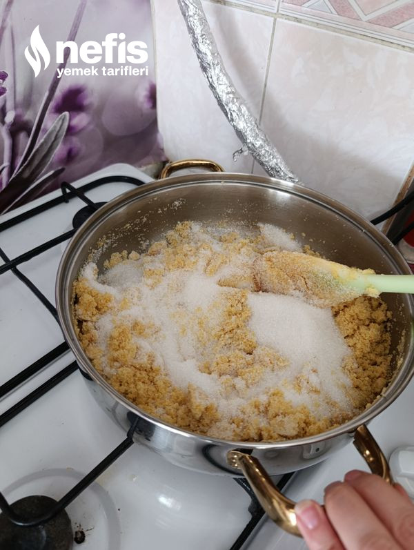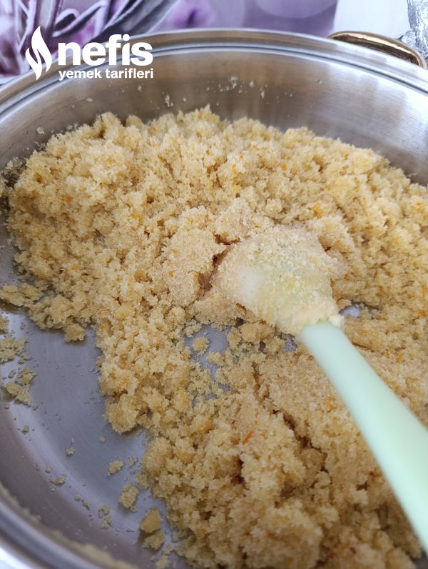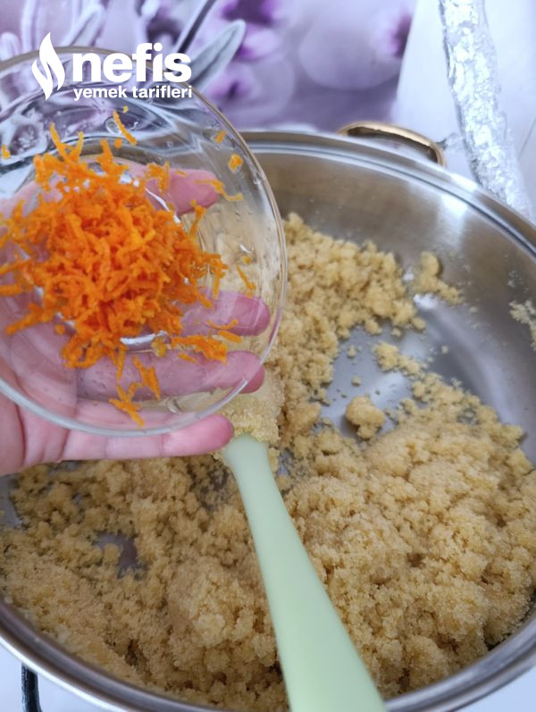 - İrmik bir sürü kavrulduktan sonra portakal kabuğu ve fıstık ek edilir.