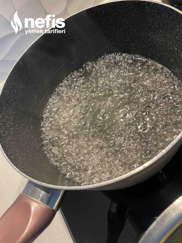 1. Helvamız için birinci olarak ufak bir tencereye şeker ve suyu alıp kaynamaya bırakalım.