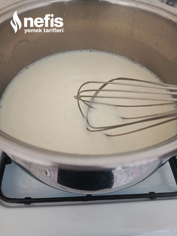 - Uygun bi tencereye süt şeker irmik nişasta ve hindistan cevizini alıp kaynayana kadar karıştıralım ki tabanı tutmasın.