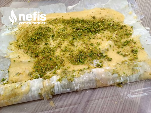 - Baklavalık yufkalarımızı iki kat üst üste koyup üzerine sosumuzdan ekliyoruz sosumuzun üzerine fıstıklarımızı serpiyoruz.