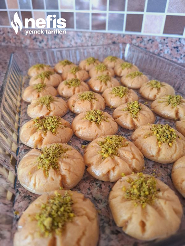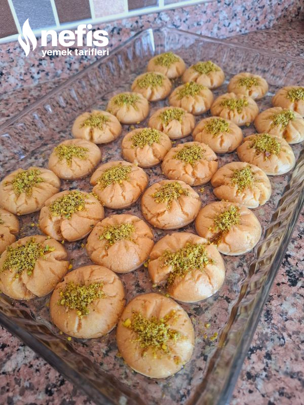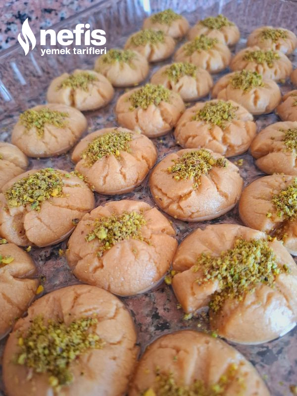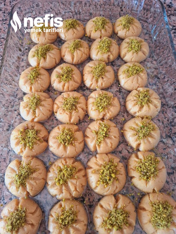 9. Fırından çıkardığımız kurabiyelerin birinci sıcağı çıktıktan sonra ılınmış olan şerbeti üzerine gezdirelim ve üzerini istediğimiz üzere süsleyelim ben toz fıstık kullandım, afiyet olsun 🤗