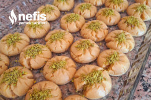 9. Fırından çıkardığımız kurabiyelerin birinci sıcağı çıktıktan sonra ılınmış olan şerbeti üzerine gezdirelim ve üzerini istediğimiz üzere süsleyelim ben toz fıstık kullandım, afiyet olsun 🤗