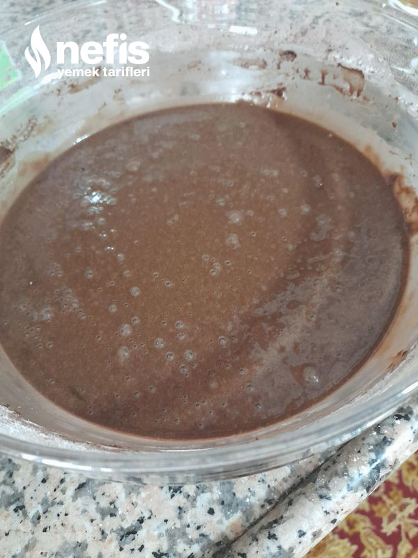 2. Daha sonra sıvı gereçleri ekleyip tekrar çırpalım, sonra un, kabartma tozu, vanilya ve kakaoyu eleyerek üzerine ek edelim ve çırpalım.