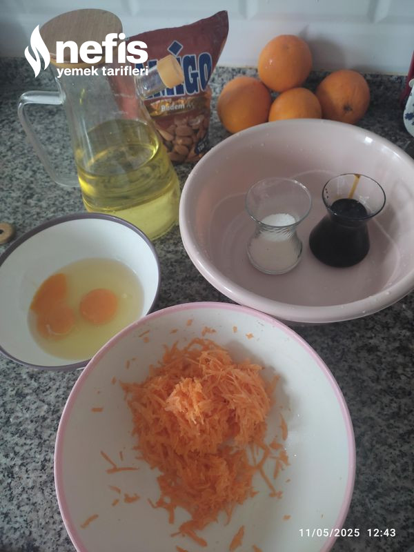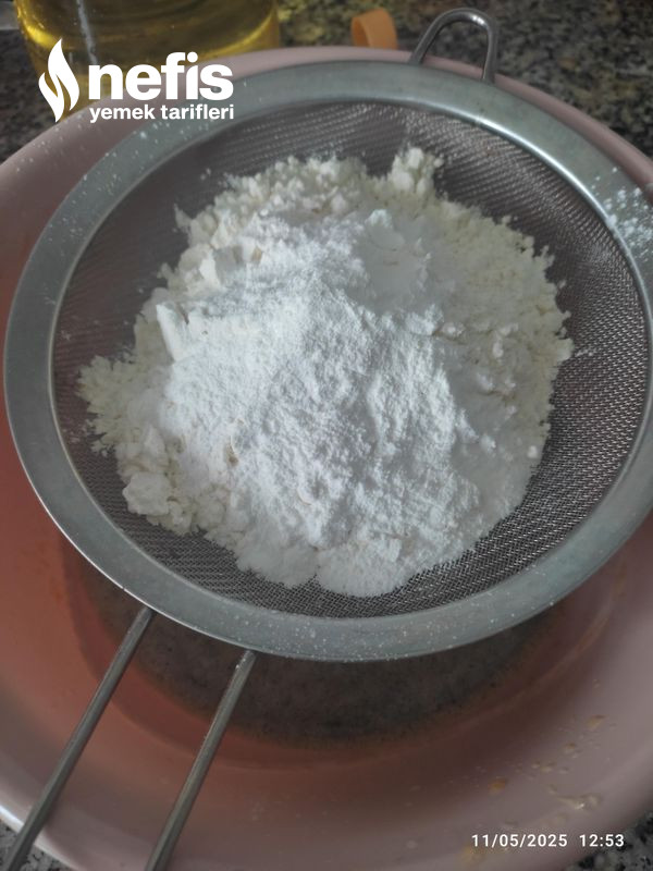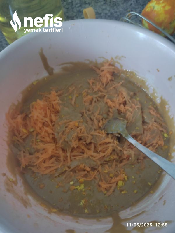 2. Üzerine unu, kabartma tozunu birlikte eleyerek ilave ediyoruz karıştırıyoruz havucu rendenin ince tarafıyla rendeleyip, onu da karıştırıp, kalıba döküyoruz.