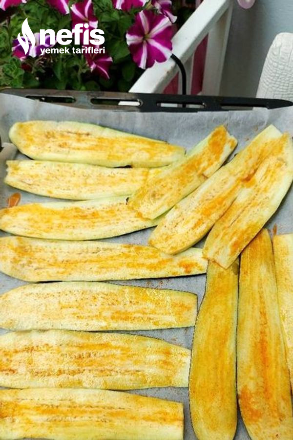 1. Patlıcanları uzunlamasına ince dilimleyin. Tuzlu suda 15 dakika bekletin. Fırın tepsisine alın.