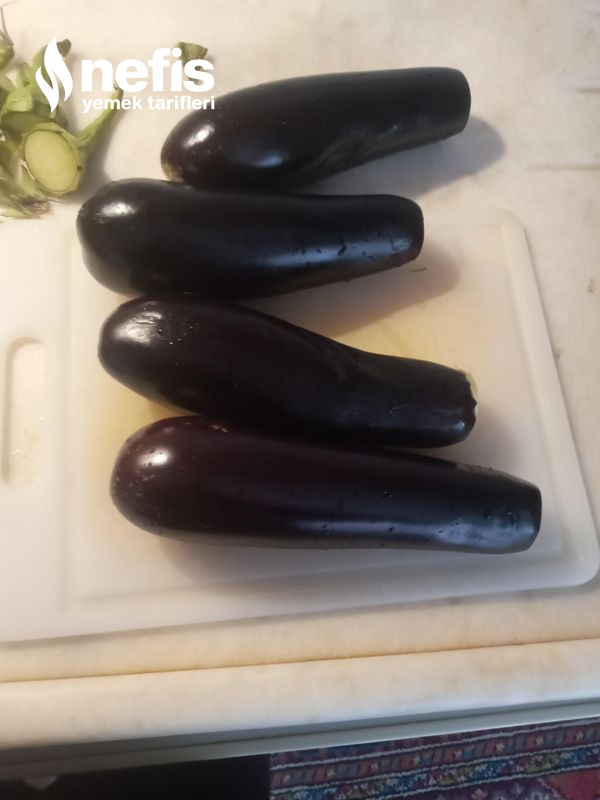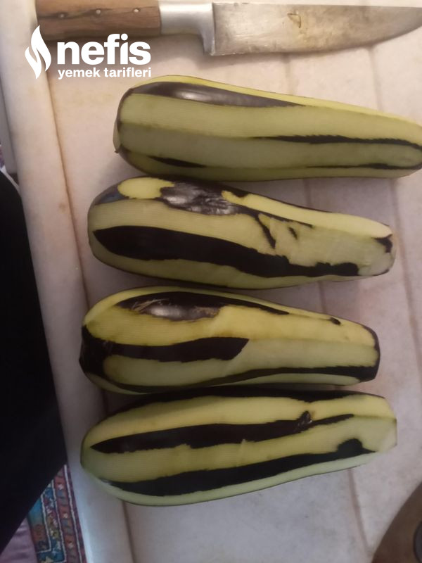 - Daha sonra patlıcanlarımızı soyup daha sonra ince ince dilimliyoruz.