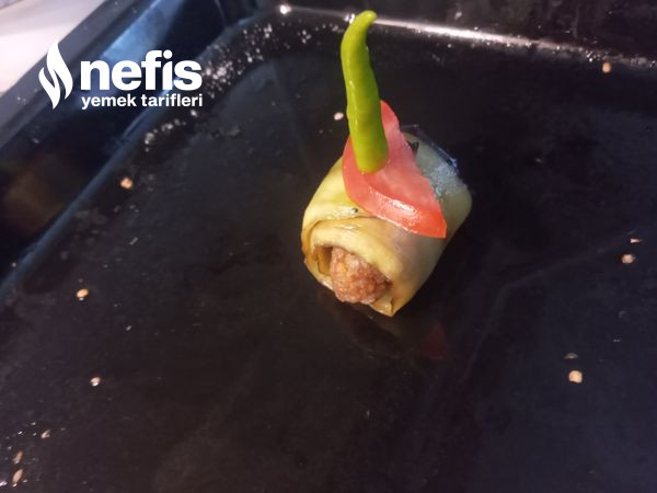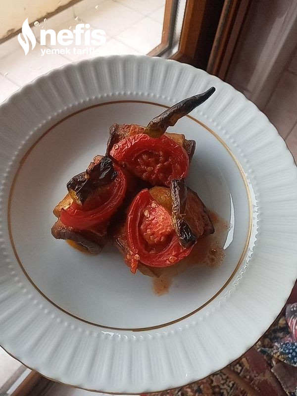 - Kızarttığımız köfteleri patlıcan etrafına sarıyoruz ve kürdan yardımıyla destekliyoruz. Ve üzerine dilimlediğimiz domates ve biberlerden yerleştiriyoruz.