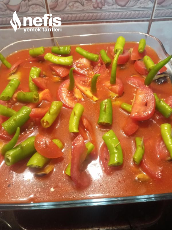 - Kaynadıktan sonra ise sardığımız patlıcanların üzerine suyu ekleyip fırında pişirmeye başlıyoruz.