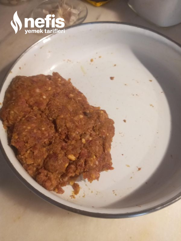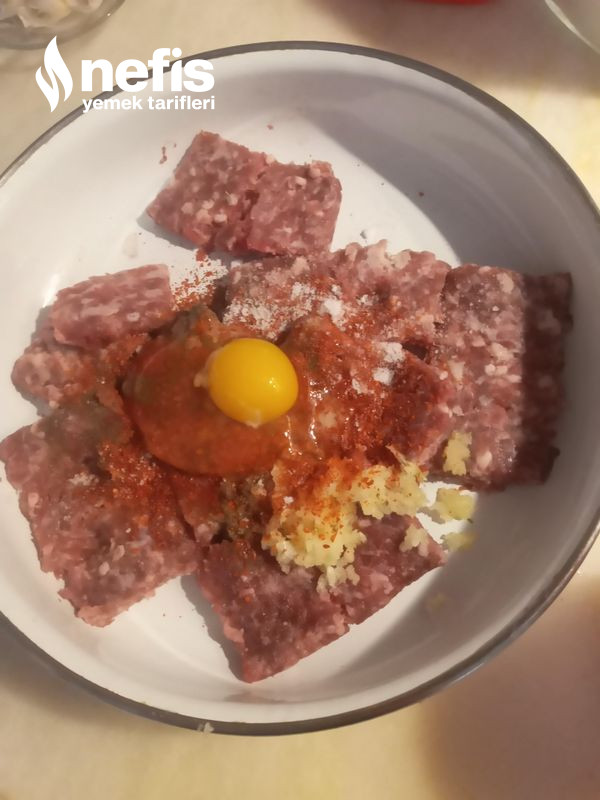 - İlk evvel köfte harcımızı yapıyoruz. Köfte harcımız için 500 gram kıymanın içerisine yumurta,ekmek ici,soğan,sarımsak, maydanoz ve baharatlarımızı ekleyip güzelce yoğuruyoruz.