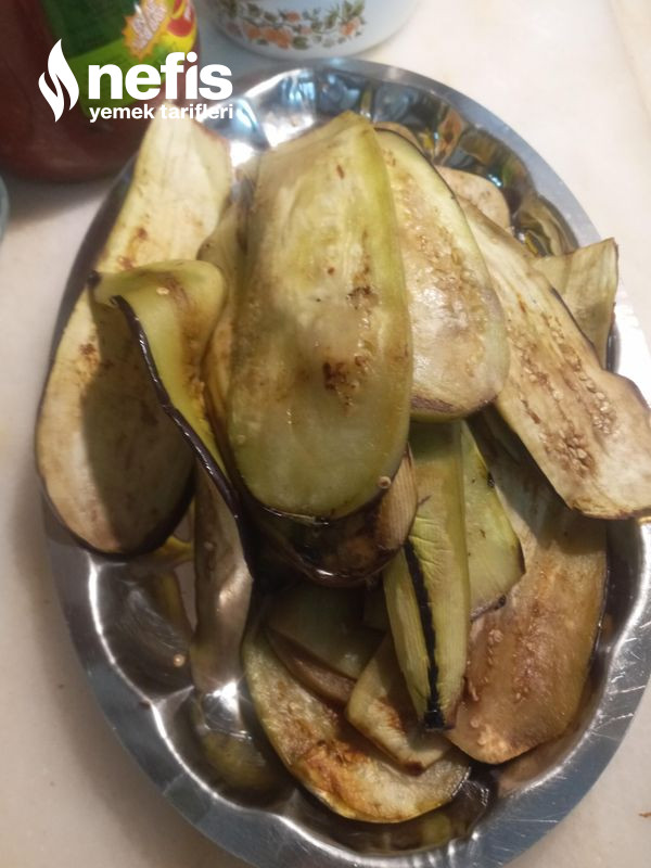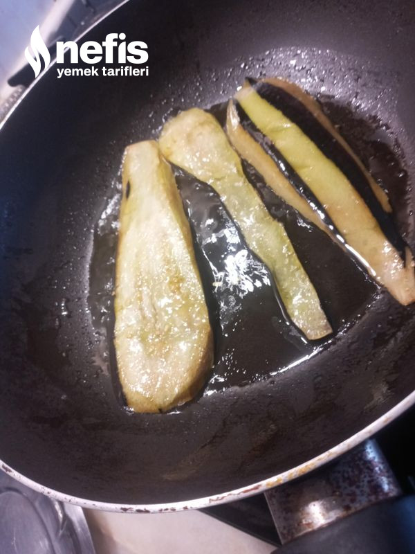 - Harmanladığımız patlıcanlarımızı az bir yağda güzelce kızartıyoruz önlü artlı olacak bir halde.
