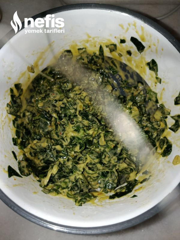 5. Soğanla bütünleşen ıspanaklarımızın içine yumurtamızı kıralım ,unumuzu koyalım ve bir kaşık yardımıyla karıştıralım.