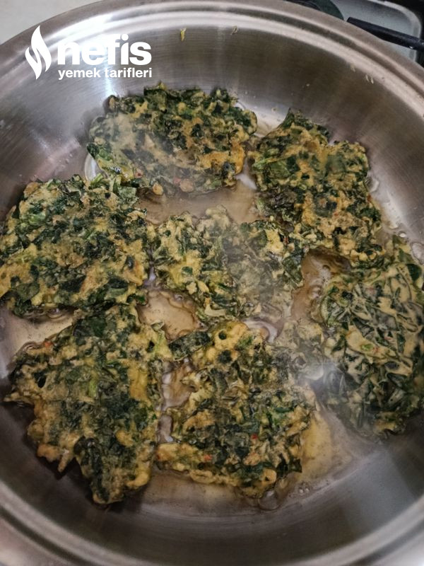 6. Un az geldiyse ek edebilirsiniz, daha sonra hafif kızgın yağda ıspanaklarımızdan birer kaşık alıp yağ atalım ve kaşığın ardıyla yavaşça bastıralım elips formunu verelim.