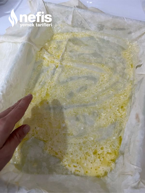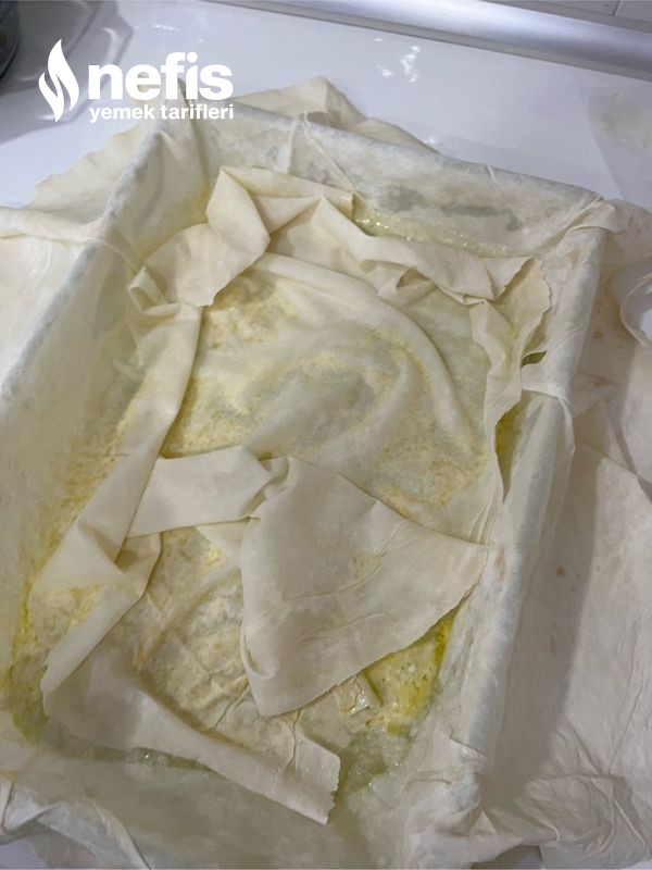 3. Borcamımızı zeytinyağı ile yağlayalım üzerine yufkalarından birini kenarları taşacak halde borcama serelim .