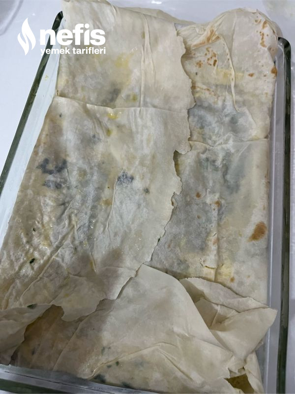 5. Üzerine ıspanaklı harcın yarısını ekleyelim üzerine tekrar yufkayı buruşuk formda serelim tekrar sosumuzdan ekleyelim.