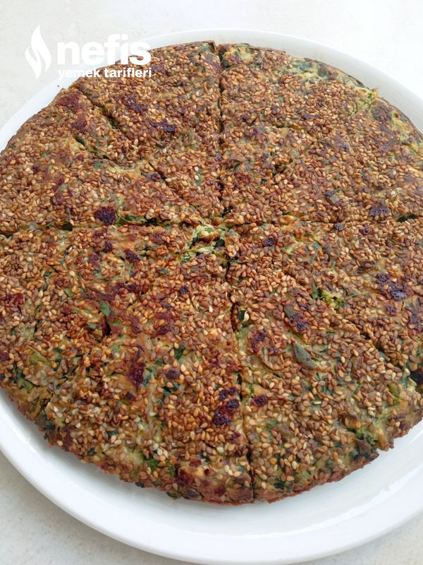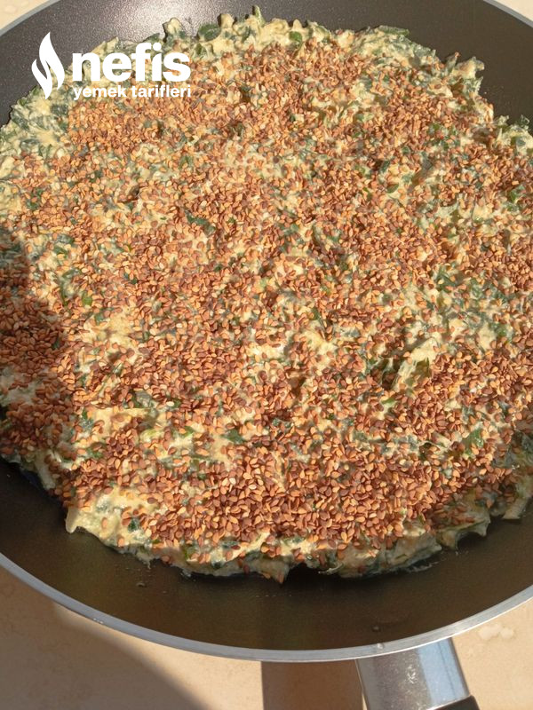 - Ardından, tüm börek harcını, yavaşça yağlanmış teflon tavaya, spatula yardımıyla yayın, akabinde üzerine susam serpip tavanın kapağını kapatın.