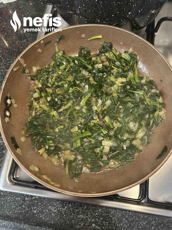 - Öncelikle iç harcını hazırlayalım, soğanı biraz kavurun, sonra ıspanağı içine atın suyunu çekene kadar pişirin ,sonra baharatlarını ekleyin. Soğumaya bırakın.
