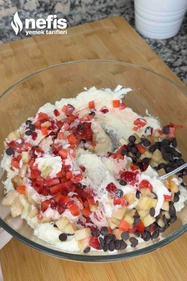 7. Çırptığımız kremanın içerisine minik doğranmış muz ve çileği ekleyelim.