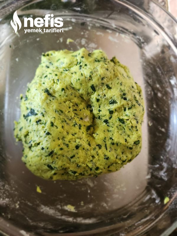 - Ispanaklı harcı geniş bir kaba alıp, üzerine kuru gereçleri ek edip yumuşak bir hamur elde edinceye kadar yoğuralım.