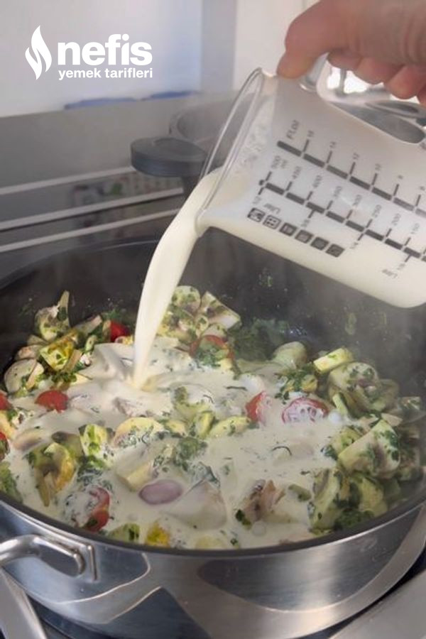 - Mantarları ve domatesleri ekleyip tekrar karıştırın. Kremayı içine döküp tuz yahut vegeta ile baharatlayın.