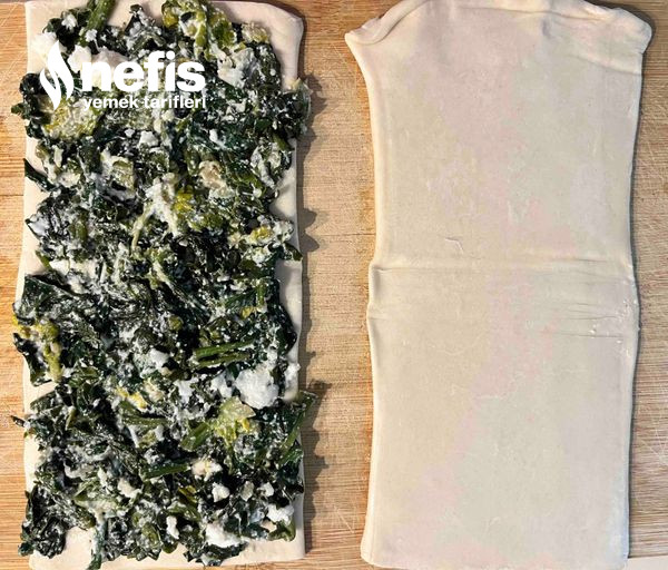 5. Kesme tahtasına 2 adet milföy hamurunu alın. Birine harçtan koyup yayın.