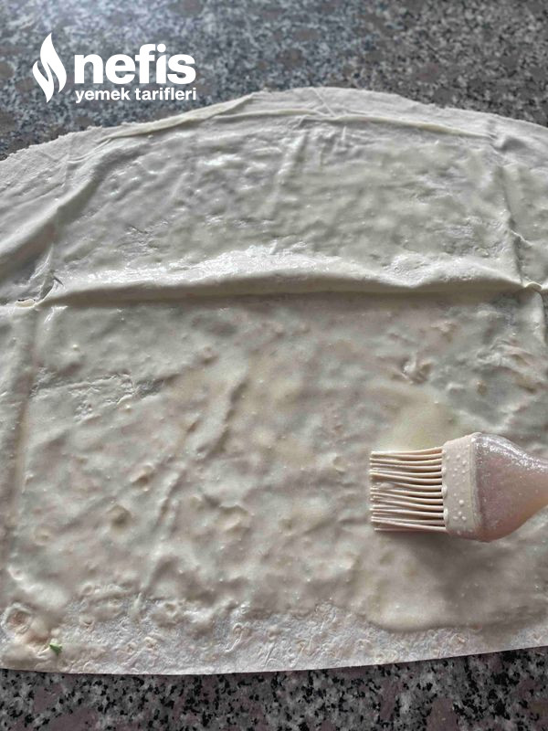 3. Yufkanın geniş olan kısmına fotoğraftaki üzere peynirli harcımızı uzunlamasına yayalım. Kenarlarından katlayalım ve saralım yağladığımız tepsinin orta kısmına koyup kendi etrafında dolayalım.