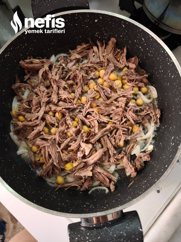 - Soğanlar biraz pembeleşince üzerine haşlanmış nohutu koyalım.