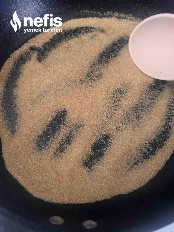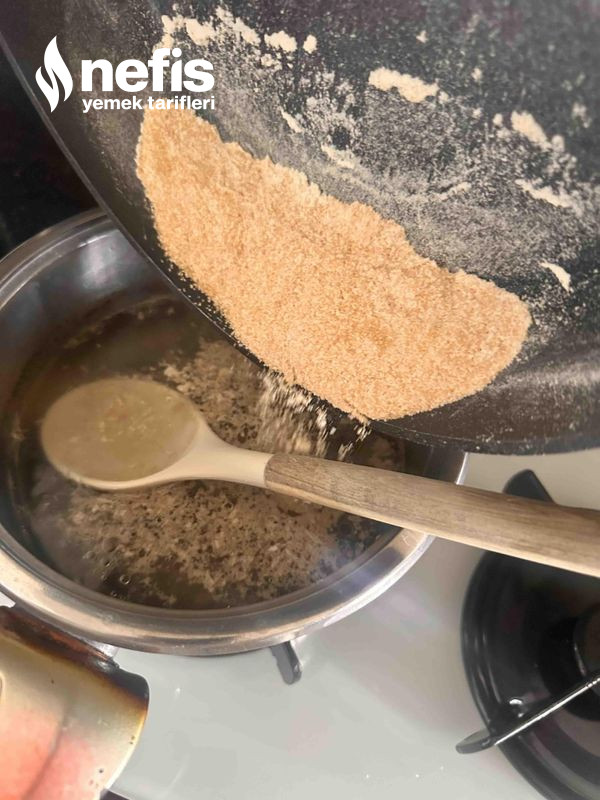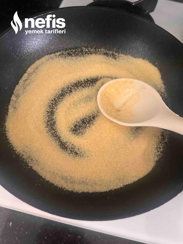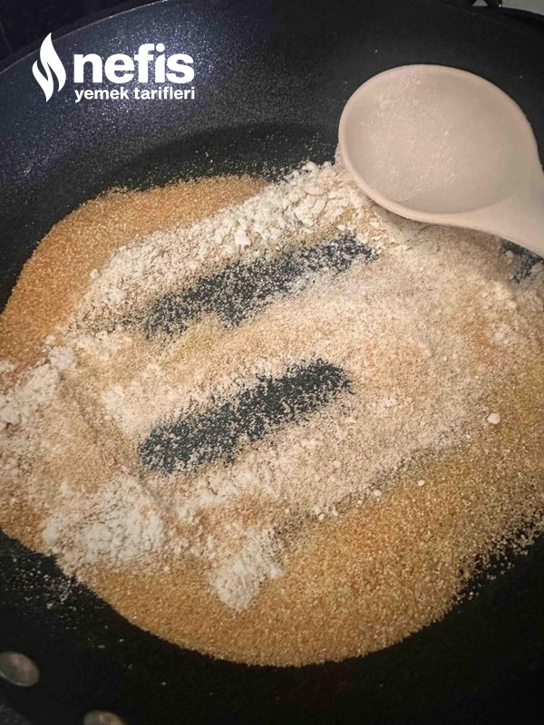 - İrmiklerin rengi değişince yanmamasına itina gösterelim sonra bir kaşık un ekleyip irmiklerle bir arada tekrar karıştırıyoruz ,un kokusu irmik ve un birleşince çabucak ocaktan indiriyoruz ( daima karıştırmak gerekir yanmaması için ).