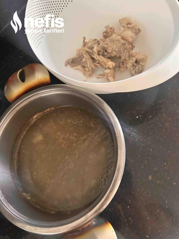 - Sonra haşladığımız tavuğun suyunu ve kemikli kısımı ayırıyoruz.