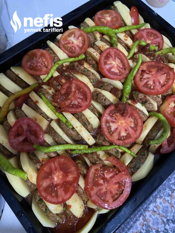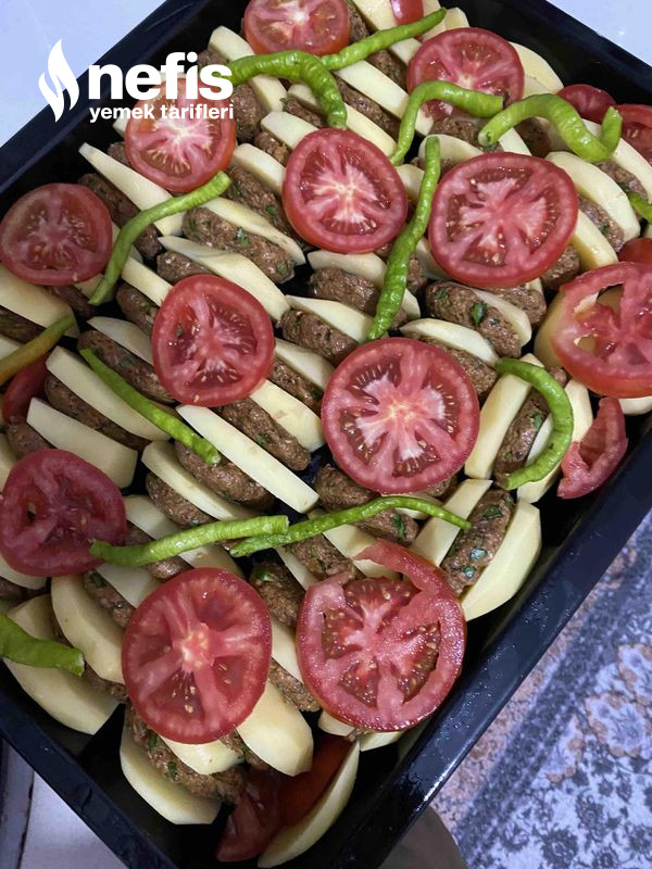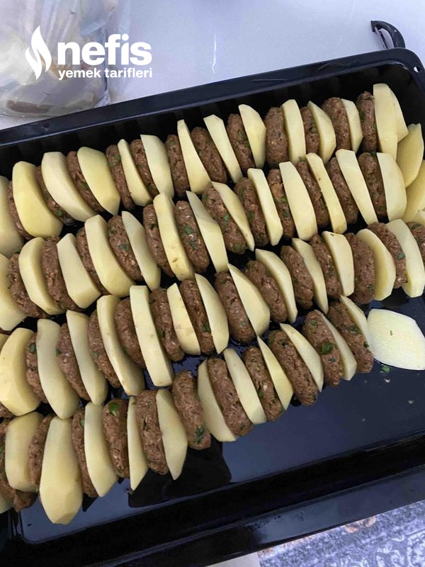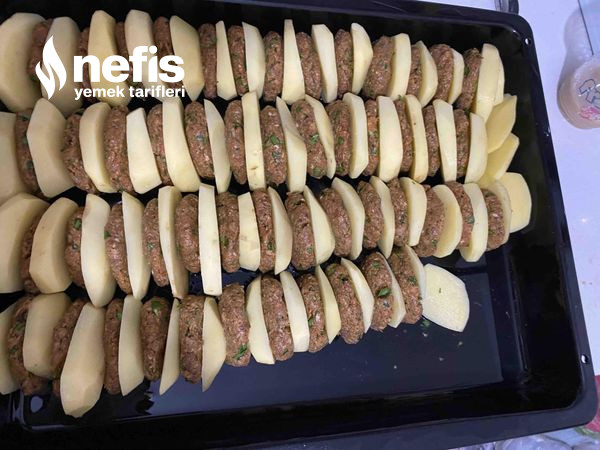 - Yağladığımız fırın tepsisine bir patates bir köfte olacak haldı uzun dizelim.