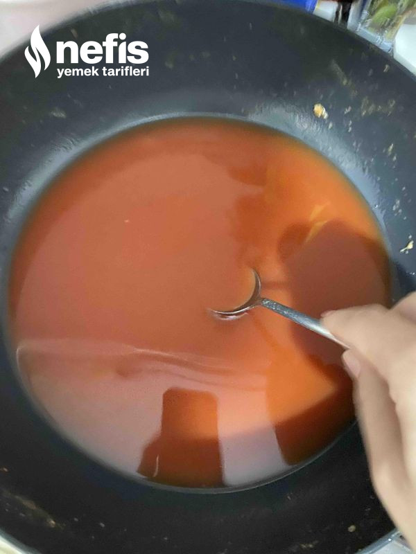 - Sosu için 1 yemek kaşığı domates 1 yemek kaşığı biber salçasını suyla açıp tepsimize dökelim.