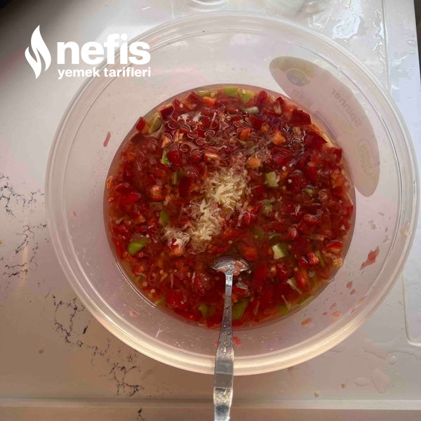 4. Üzerine domateslerimizi rendeliyoruz(domateslerin yeşil/beyaz kısımlarını rendelememeye itina gösterelim).