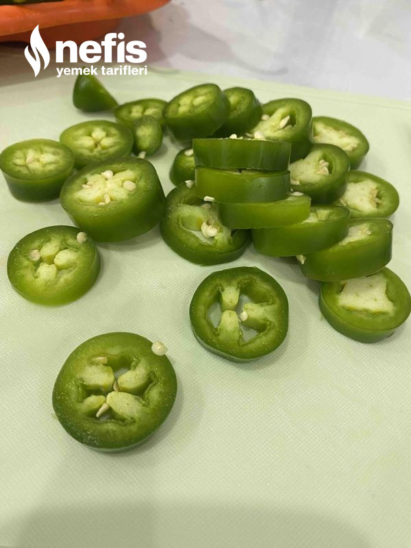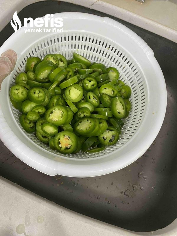 1. Biberleri yıkayıp ince ince yarım cm olacak formda doğruyoruz.