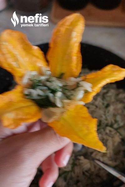 5. Sonra suyunu aldığınız kabak çiçeklerini nazikçe açın, yırtmadan hafif soğuyan içten alıp içine koyun ,çok doldurmayın,ben yaklaşık 2 tatlı kaşığı koydum.